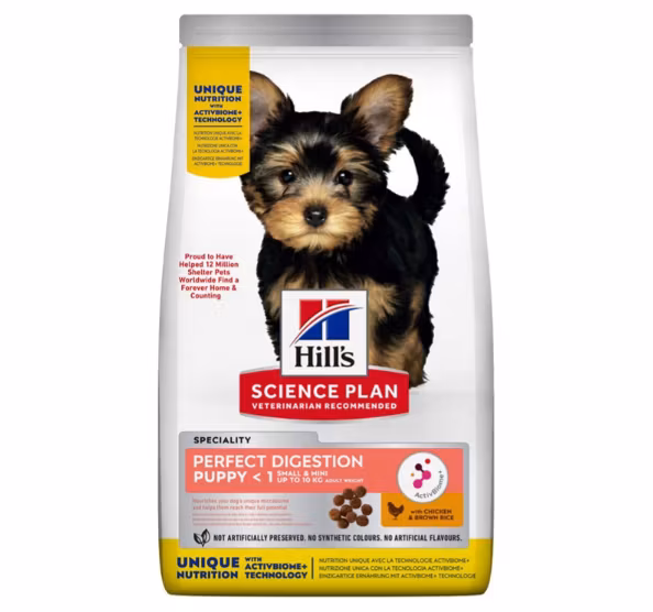 HILL'S SCIENCE PLAN Perfect Digestion Small & Mini Valpfoder med kyckling och brunt ris är ett noggrant framtaget foder för små och mini valpar upp till 12 månader, samt för dräktiga och digivande hundar. Detta foder använder Hill's prebiotiska blandning, ActivBiome+, för att aktivt främja en hälsosam matsmältning och allmänt välmående.