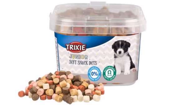 Junior Soft Snack Dots med Omega-3 är ett smakrikt hundgodis i form av små och mjuka bitar med smak av kyckling och lax. Innehåller inget tillsatt socker.