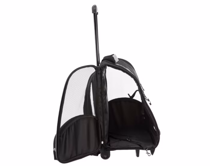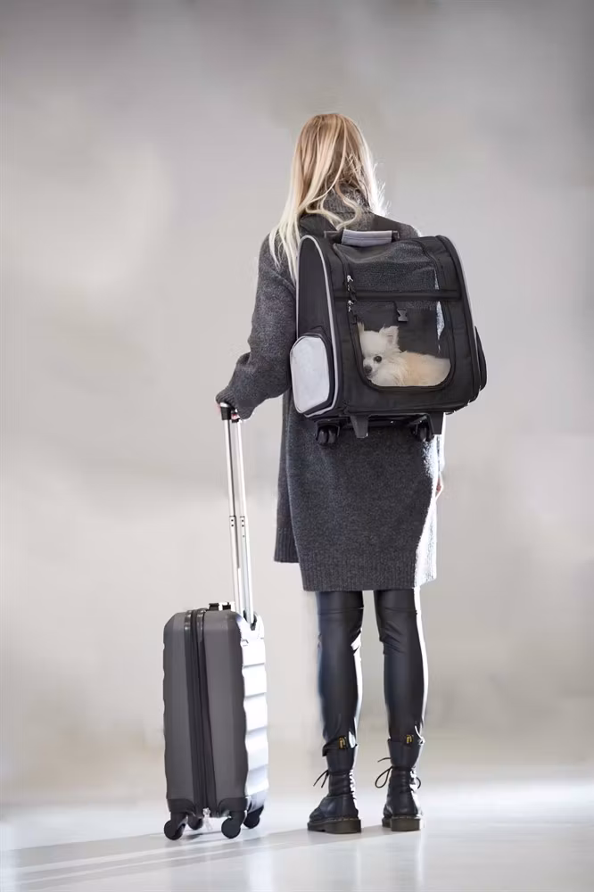 Väskan är design med ett insytt kort koppel, vilket förhindrar att husdjuret hoppar ut, vilket ökar säkerheten under resan. Den är även utrustad med två praktiska sidofickor för extra förvaring och har ett bärhandtag för mångsidighet.
