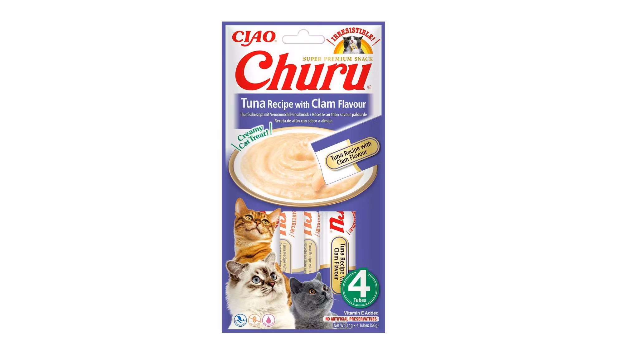 Churu Cat Tuna & Clam är ett kattgodis som är fritt från spannmål och konserveringsmedel, samt har en utsökt smak som din katt säkerligen kommer älska!