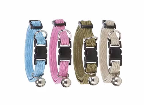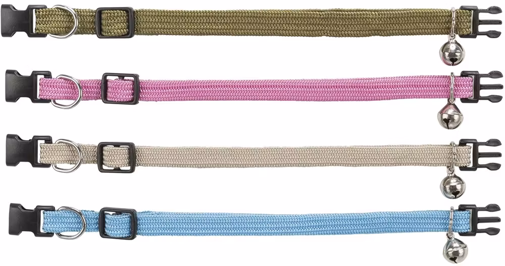 Paketet inkluderar katthalsband i fyra olika färger: rosa, ljusblå, beige och brön/grön