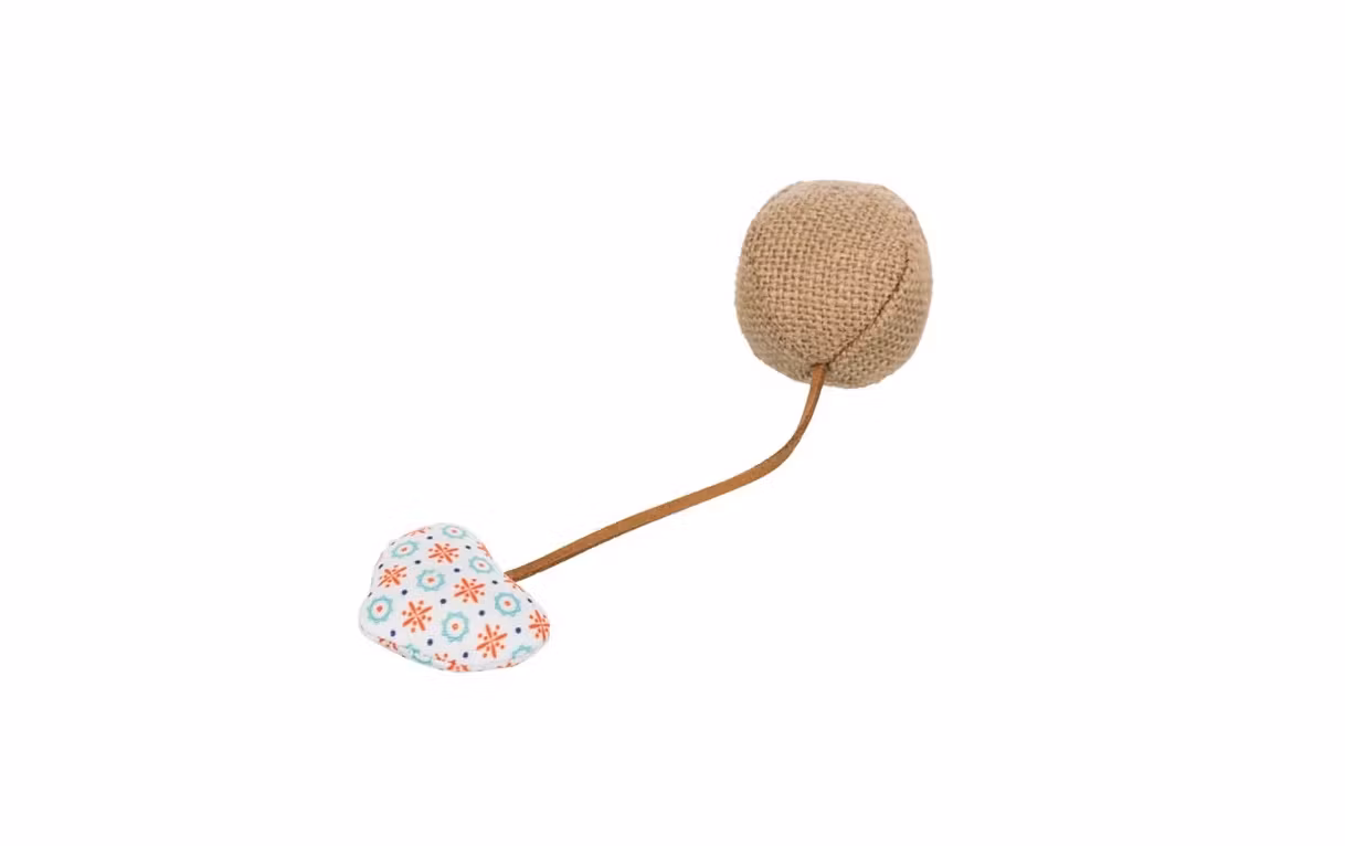 Den här roliga kattleksaken har en lite annorlunda utformning. Bollen i sisal har även följe av ett hjärta i tyg, vilket ger katten en möjlighet att variera mellan olika former och material.