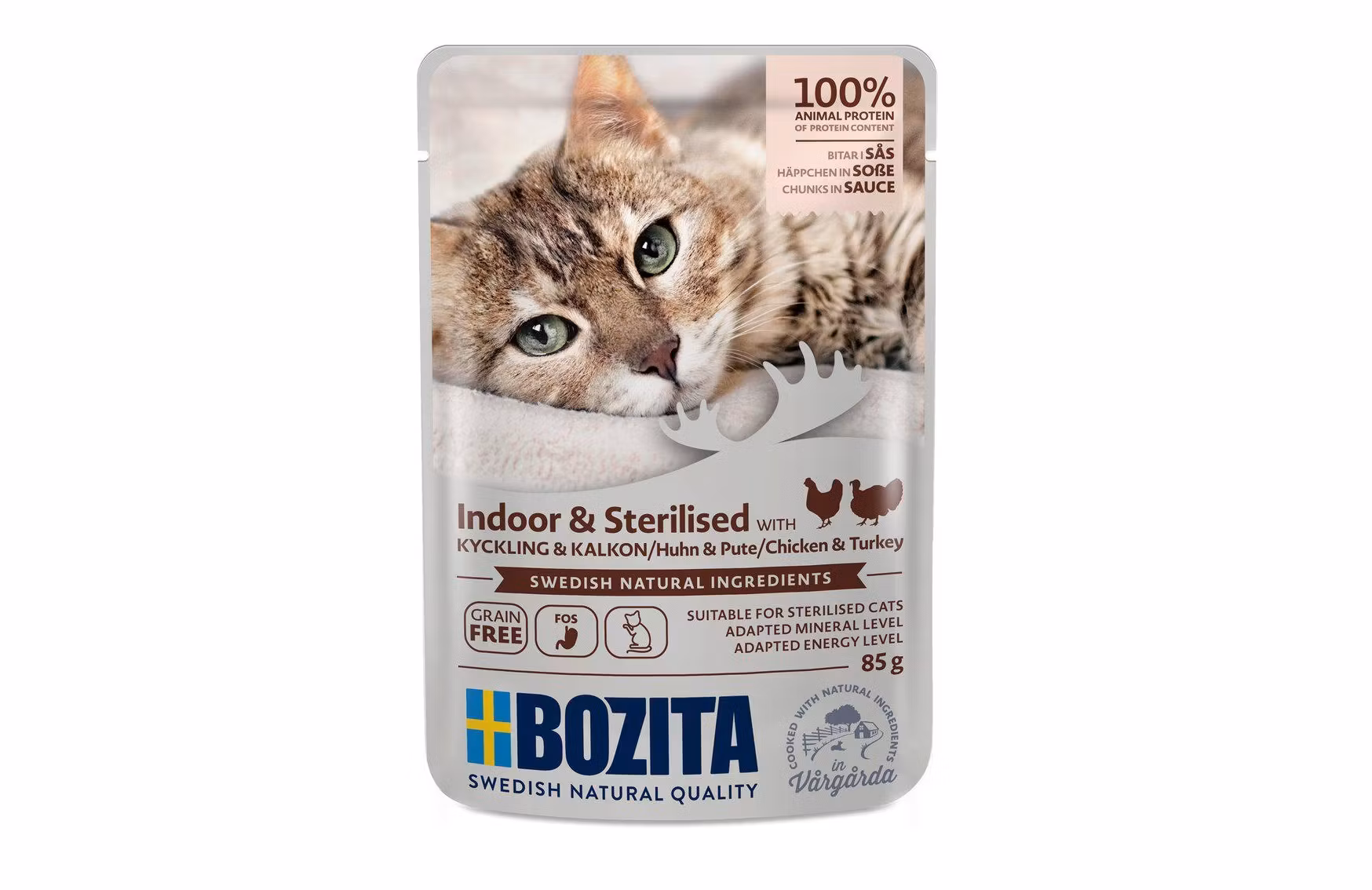 Bozita Indoor & Sterilised Kyckling & Kalkon i Sås 85g är helt och hållet spannmålsfri och innehåller endast svenska råvaror och 100% animaliska proteiner.