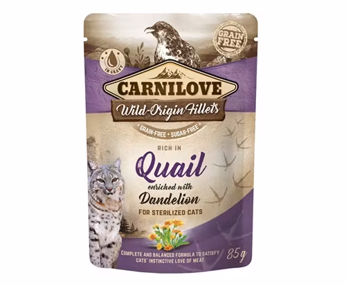Carnilove Cat Pouch Quail with Dandelion Sterilised erbjuder hypoallergen och lätt smältbar vaktelkött som är perfekt för katters matsmältning.