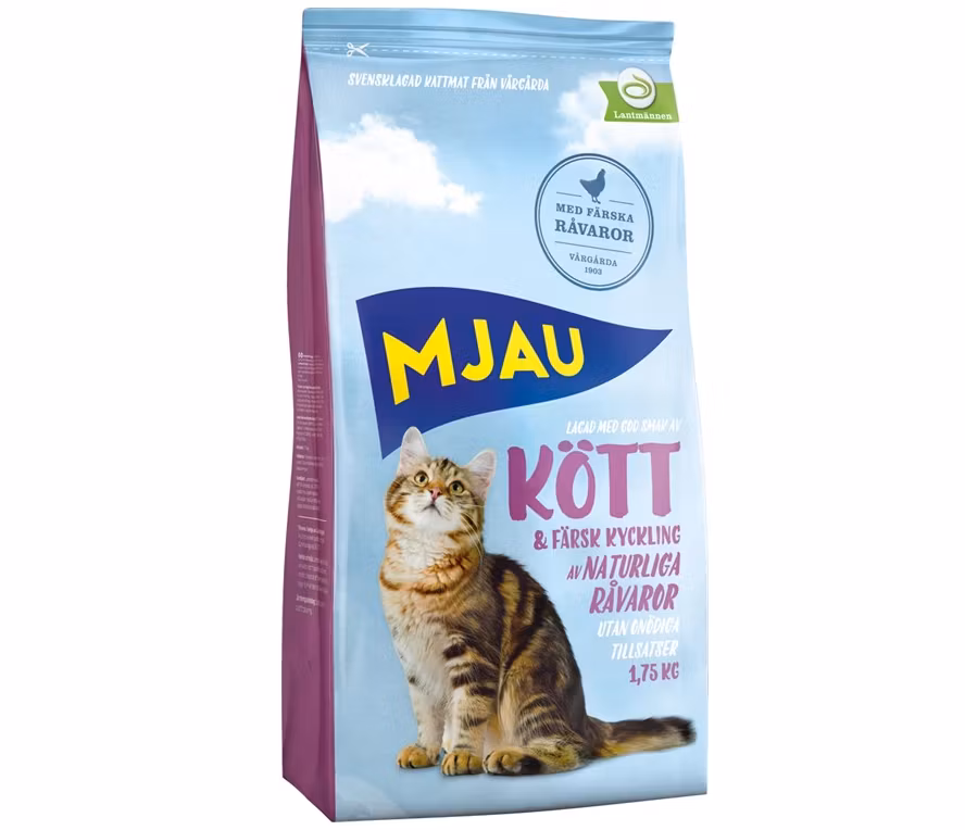 Mjau Köttsmak Torrfoder är ett helfoder gjort på naturliga råvaror utan konstgjorda färgämnen eller onödiga tillsatser.