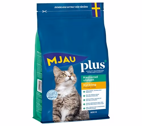Mjau Plus är ett kvalitativt torrfoder för kastrerade utekatter och är rikt på färsk svensk kyckling och högvärdiga animaliska proteiner.