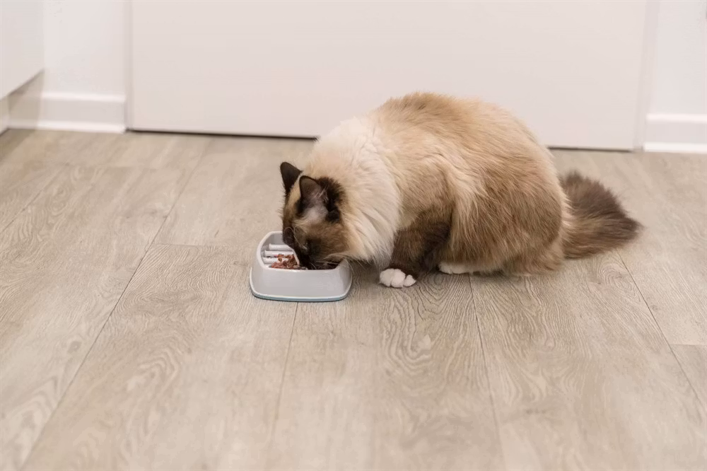 Matskålens utformning gör det betydligt svårare för djuret att komma åt fodret, oavsett om det är torr- eller våtfoder. Detta förhindrar att de kastar i sig maten, vilket minskar risken för spyor och att katten/hunden äter för mycket.